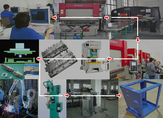 開(kāi)發(fā)&設(shè)計(jì) → 激光加工 → 轉(zhuǎn)塔數(shù)沖 → 折彎 → 模具沖壓 → 焊接裝配 → 打磨 → 清洗 → 涂裝 → 組裝 → 檢查 → 成品…